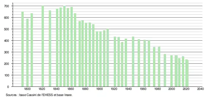L'évolution du nombre d'habitants est connue à travers les recensements de la population effectués dans la commune depuis 1793. Pour les communes de moins de 10 000 habitants, une enquête de recensement portant sur toute la population est réalisée tous les cinq ans, les populations légales des années intermédiaires étant quant à elles estimées par interpolation ou extrapolation[38]. Pour la commune, le premier recensement exhaustif entrant dans le cadre du nouveau dispositif a été réalisé en 2005[39].