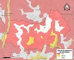 Le retrait-gonflement des sols argileux est susceptible d'engendrer des dommages importants aux bâtiments en cas d’alternance de périodes de sécheresse et de pluie. 78,6 % de la superficie communale est en aléa moyen ou fort (67,4 % au niveau départemental et 48,5 % au niveau national). Sur les 175 bâtiments dénombrés sur la commune en 2019, 140 sont en aléa moyen ou fort, soit 80 %, à comparer aux 81 % au niveau départemental et 54 % au niveau national. Une cartographie de l'exposition du territoire national au retrait gonflement des sols argileux est disponible sur le site du BRGM[29],[Carte 3].
