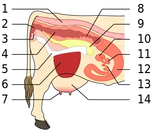 Les ovaires de la vache sont localisés à mi-hauteur du corps de l'ilium, à 40 cm de la vulve. Ils sont de petite taille (10 à 20 g) et en forme d'amande. Les ovaires sont contenus dans des bourses ovariques qui s'ouvrent sur les oviductes. C'est dans l'oviducte que se déroule la fécondation et les premiers stades de développement de l'embryon. L'oviducte est composé d'un infundibulum ouvert sur la bourse ovarique, d'une ampoule et d'un isthme rétréci qui débouche dans la corne utérine. L'utérus, organe de la gestation, est séparé en deux cornes utérines de 35 à 40 cm légèrement circonvolutionnées. Le col de l'utérus mesure une dizaine de centimètres. Ses plis en collerette lui donnent la forme d'une fleur épanouie lorsqu'elle est observée de face. Le vagin est relativement long : 30 cm de long pour 5 à 6 cm de diamètre. Il s'arrête au niveau du méat urétral et des vestiges de l'hymen[9]. La vulve mesure seulement 10 cm. Elle débouche sur les deux lèvres et le clitoris.