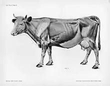 L'appareil digestif des bovins est représentatif des ruminants, herbivores prégastriques qui appartiennent tous aux Cétartiodactyles (comme les cerfs, les moutons, les girafes, les hippopotames, les Camélidés mais aussi les baleines à fanons qui possèdent une poche fermentaire occupant 2 % de leur volume corporel) dont l'ancêtre commun était peut-être déjà prégastrique[14]. Cet appareil se caractérise par la présence de trois pré-estomacs, la panse, le bonnet et le feuillet, et de l'estomac proprement dit, permettant par la rumination, la digestion microbienne prégastrique réalisée essentiellement par des bactéries[15] et des champignons[16]. Le premier compartiment par lequel passent les aliments est la panse ou rumen. À son entrée se tient un repli de peau, la gouttière œsophagienne, qui permet au lait chez le jeune et à l'eau chez l'adulte de passer directement de l'œsophage au feuillet.