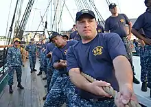 Les manœuvriers sont chargés de la mise en œuvre et de l'entretien des apparaux de manœuvre (guindeaux, amarres, ligne de mouillage...) ainsi que de la drome (les embarcations). À la mer, c'est un manœuvrier (et non un timonier[5]) qui tient la barre qui permet de gouverner. Le « bosco » qui est le « patron » des manœuvriers est généralement un officier marinier supérieur.