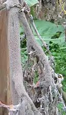 - Sur les rameaux : les attaques sont plus rares et surviennent les années très pluvieuses à partir d'autres organes infectés. Les sarments présentent un feutrage de mycélium et une altération brune des tissus avant l'aoûtement, blanchissant plus tard. Des petites protubérances noires (sclérotes) apparaissent ensuite. Elles se placent dans les replis de l’écorce (sous forme de mycélium) et sont plus nombreuses à l’extrémité des sarments qu’à leur base[15].