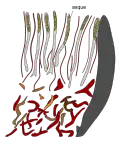 - 3. apothécies : ce sont des ascocarpes (fructification d'ascomycètes) assurant la reproduction sexuée, en forme de coupe ouverte portée par un pied (en trompette) et contenant les compartiments allongés (ou asques) qui renferment des (asco)spores et des filaments stériles (ou paraphyses). Les apothécies qui apparaissent au-dessus des ascogones, sont brunâtres, portées par une tige de 3-10 mm, émergeant de sclérotes. Bien que les apothécies soient extrêmement rarement observées dans la nature, on suppose qu'une reproduction sexuée régulière a lieu, comme le suggèrent des preuves indirectes[10] .