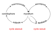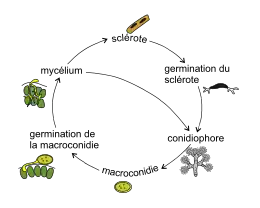sclérote → conidiophore → (macro)conidie → mycélium, décrite précédemment au cours du cycle asexué annuel.