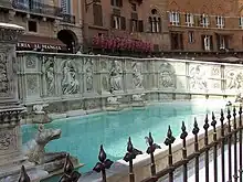 La construction de la Fonte Gaia tranche avec le style des complexes des fontaines monumentales érigées initialement. Elle a été construite à ciel ouvert directement sur la Piazza del Campo. Elle possède un seul bassin réservé uniquement à l’eau potable pour la consommation humaine. L’absence de source d’eau a dicté un nouveau style architectural et un nouveau type d’alimentation. Cette nouvelle référence s’inscrivait dans le plan d’urbanisme, sociétal et économique mis en place par le Gouvernement des Neuf qui voulait créer un nouveau pôle d’attraction au centre de la ville[4]. Son créateur, Jacopo della Quercia a sculpté dans le marbre une fontaine de style Renaissance comportant plusieurs panneaux dont un portrait de Marie, des allégories des vertus et des personnages bibliques. Une copie a été réalisée à la fin du XIXe siècle par Tito Sarrocchi, les panneaux originaux fortement érodés ont été conservés d’abord au Palazzo Pubblico puis au musée de l’Hôpital Santa Maria Della Scala[4].