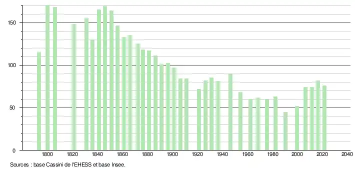L'évolution du nombre d'habitants est connue à travers les recensements de la population effectués dans la commune depuis 1793. Pour les communes de moins de 10 000 habitants, une enquête de recensement portant sur toute la population est réalisée tous les cinq ans, les populations légales des années intermédiaires étant quant à elles estimées par interpolation ou extrapolation[20]. Pour la commune, le premier recensement exhaustif entrant dans le cadre du nouveau dispositif a été réalisé en 2006[21].