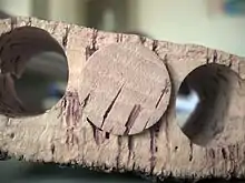 Le tubage mécanique de la bande, perpendiculairement aux couches de croissance, est réalisé dans une tubeuse (machine automatique ou manuelle). Son emporte-pièce rotatif de diamètre légèrement supérieur à celui du bouchon demandé (25 mm pour fabriquer des bouchons de 24 mm), perfore la bande, au plus près du ventre[8], là où le grain du liège est le plus fin, découpant un cylindre de liège représentant un ébauchon. Le tubage ne s'effectue pas perpendiculairement à la bande, ce qui rendrait le bouchon trop poreux en raison de la présence de lenticelles, fins canaux bruns qui, en traversant radialement le liège, permettent les échanges gazeux entre l'intérieur de l'arbre et le milieu extérieur. Ces lenticelles qui constituent la macroporosité du liège, sont un des critères d'évaluation de la qualité de ce matériau (plus elles sont fines et rares, meilleure est la qualité du liège)[9].