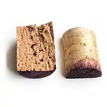 - Pour les bouteilles de bière ou les vins tranquilles, les bouchons peuvent être de liège aggloméré, fabriqué à partir de fragments de liège provenant de chutes de fabrication, les granulés de liège auxquels on ajoute une colle polyuréthane alimentaire étant pressés puis extrudés sous forme de bâtons coupés à la longueur souhaitée puis adaptés et chanfreinés par ponçage au diamètre définitif[2].