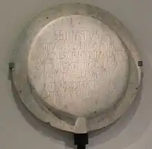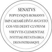 Ceci signifie que « Le Sénat et le peuple romain à l’empereur César Auguste, fils du Divin (César) consul pour la 8e fois, ont offert ce bouclier pour sa vaillance, sa clémence, son sens de la justice, son sens du devoir envers les dieux et la Patrie[2] ». Une autre inscription semblable mais très fragmentaire a été trouvée à Rome[4].