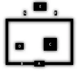 - le bâtiment principal (C) : kondō (金堂, littéralement « salle d'or ») ou honden (本殿, littéralement « palais principal »), ou butsuden (仏殿, littéralement « palais de Bouddha ») dans le bouddhisme zen,