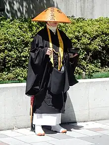 Au Japon aussi, la mendicité a disparu. Elle reste cependant en vigueur à titre de formation des futurs moines et nonnes zen, et elle est alors connue sous le nom de Takuhatsu (japonais: 托鉢), littéralement «tendre le bol [pour mendier] »[47],[48]. Dans leur cas, ils portent aujourd'hui des vêtements traditionnels remontant au Moyen Âge, portant un bâton et une clochette pour avertir les gens de leur présence[48]. Ils arborent un insigne indiquant leurs noms bouddhiques et ceux de leurs monastères. Le plus souvent, ils se déplacent en petits groupes de dix à quinze, parcourant les rues en file indienne et tendant leurs bols aux fidèles; il arrive aussi qu'ils signalent leur présence en criant le mot Hō (« Dharma »)[49], ou encore qu'ils récitent des soutra pour le bien des donateurs, lesquels leur offrent en général du riz non cuit ou de l'argent[47],[48],[Note 7]. On rencontre aussi des moines solitaires. Ils sont souvent à proximité d'un temple ou d'un lieu de passage (parc, gare...) pour recevoir les offrandes[50].