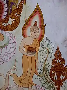 À ce moment arrivent les quatre dieux gardiens des quatre directions (Lolkapala) pour lui fournir un bol. C'est ce bol qui devra désormais servir au Bouddha dans ses tournées de mendicité, et on peut s'attendre qu’après la mort de ce dernier, il deviendra donc une relique vénérée[25],[26]. Les dieux lui offrent des bols en or, que le Bouddha refuse car l'or ne convient pas à un moine mendiant. Ils lui proposent alors successivement six autres matières (argent, jade, saphir, etc.) qu'il rejette à chaque fois. Finalement, ils apportent un bol de pierre, suivant en cela la règle monastique, et le Bouddha l'agrée. Mais il juge inutile d’avoir quatre bols. De crainte toutefois de peiner les trois autres dieux s'il n'accepte qu'un bol, il transforme les quatre récipients en un seul, qui garde cependant à son sommet la trace du rebord des trois autres[25].