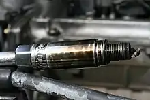 - et enfin, en raison des manutentions éventuelles lors du changement de bougies, aux vibrations du moteur, aux variations de températures rapides, mais surtout en raison des pressions régnant dans la chambre de combustion[Note 1], la résistance à la rupture de l'isolateur doit être suffisamment importante afin d'éviter que ce dernier ne se fendille, voir rompe[10],[13]. L'électrode centrale est ainsi recouverte d'un isolant en céramique[8].