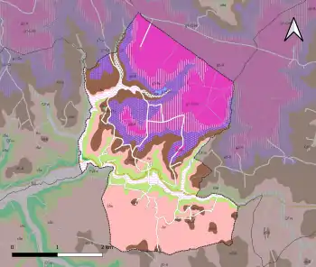 L'occupation des sols de la commune, telle qu'elle ressort de la base de données européenne d’occupation biophysique des sols Corine Land Cover (CLC), est marquée par l'importance des forêts et milieux semi-naturels (62,9 % en 2018), néanmoins en diminution par rapport à 1990 (66,6 %). La répartition détaillée en 2018 est la suivante : forêts (55,2 %), zones agricoles hétérogènes (33,1 %), milieux à végétation arbustive et/ou herbacée (7,7 %), terres arables (3,4 %), prairies (0,6 %)[32]. L'évolution de l’occupation des sols de la commune et de ses infrastructures peut être observée sur les différentes représentations cartographiques du territoire : la carte de Cassini (XVIIIe siècle), la carte d'état-major (1820-1866) et les cartes ou photos aériennes de l'IGN pour la période actuelle (1950 à aujourd'hui)[Carte 3].