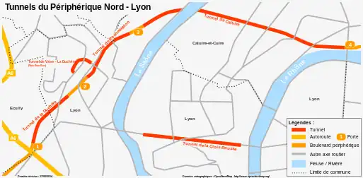 - 7 portes (Vaise, Rochecardon, La Pape, Croix-Luizet, Valvert, La Doua, St Clair) délimitant spécifiquement la section Périphérique nord et neuf autres pour l’accès à l’ensemble du périphérique,
