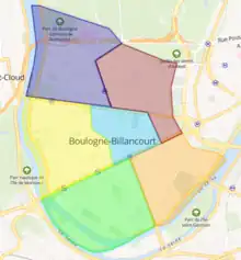Au sud-ouest de la ville, est située l'île Seguin, ancien centre historique de Renault et symbole du passé industriel de Boulogne-Billancourt. La commune dispose également de 33,44 ha d'espaces verts[3] dont près de la moitié compose le parc Edmond-de-Rothschild (15 ha), situé au nord-ouest de la commune (quartier Menus - Jean-Baptiste-Clément).