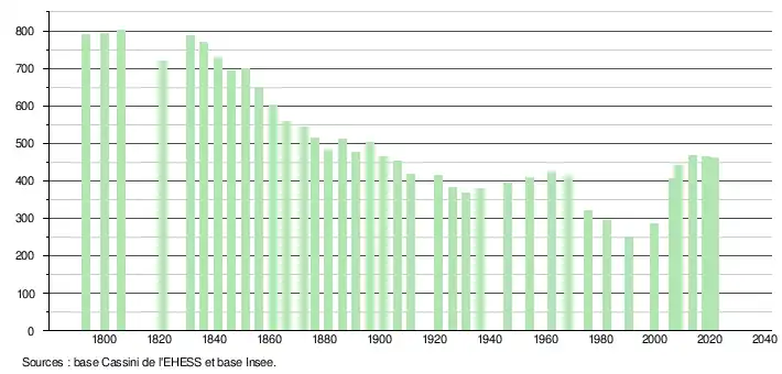 L'évolution du nombre d'habitants est connue à travers les recensements de la population effectués dans la commune depuis 1793. Pour les communes de moins de 10 000 habitants, une enquête de recensement portant sur toute la population est réalisée tous les cinq ans, les populations légales des années intermédiaires étant quant à elles estimées par interpolation ou extrapolation[31]. Pour la commune, le premier recensement exhaustif entrant dans le cadre du nouveau dispositif a été réalisé en 2008[32].