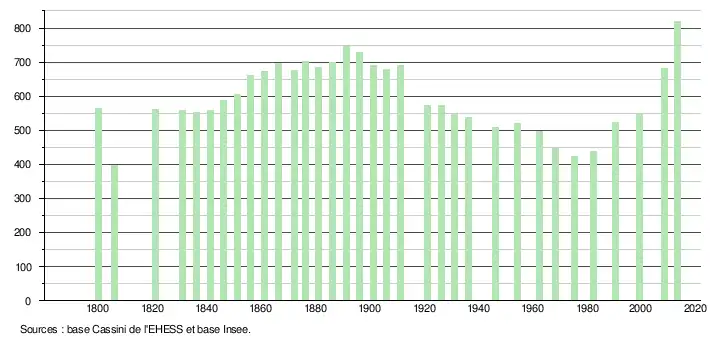 L'évolution du nombre d'habitants est connue à travers les recensements de la population effectués dans la commune depuis 1800. À partir du , les populations légales des communes sont publiées annuellement dans le cadre d'un recensement qui repose désormais sur une collecte d'information annuelle, concernant successivement tous les territoires communaux au cours d'une période de cinq ans. Pour les communes de moins de 10 000 habitants, une enquête de recensement portant sur toute la population est réalisée tous les cinq ans, les populations légales des années intermédiaires étant quant à elles estimées par interpolation ou extrapolation[14]. Pour la commune, le premier recensement exhaustif entrant dans le cadre du nouveau dispositif a été réalisé en 2008[15],[Note 2].