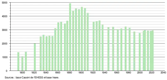 L'évolution du nombre d'habitants est connue à travers les recensements de la population effectués dans la commune depuis 1793. Pour les communes de moins de 10 000 habitants, une enquête de recensement portant sur toute la population est réalisée tous les cinq ans, les populations légales des années intermédiaires étant quant à elles estimées par interpolation ou extrapolation[21]. Pour la commune, le premier recensement exhaustif entrant dans le cadre du nouveau dispositif a été réalisé en 2008[22].