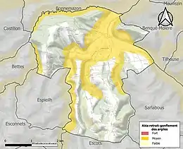 Le retrait-gonflement des sols argileux est susceptible d'engendrer des dommages importants aux bâtiments en cas d’alternance de périodes de sécheresse et de pluie. 37,1 % de la superficie communale est en aléa moyen ou fort (44,5 % au niveau départemental et 48,5 % au niveau national). Sur les 131 bâtiments dénombrés sur la commune en 2019, 83 sont en aléa moyen ou fort, soit 63 %, à comparer aux 75 % au niveau départemental et 54 % au niveau national. Une cartographie de l'exposition du territoire national au retrait gonflement des sols argileux est disponible sur le site du BRGM[35],[Carte 3].