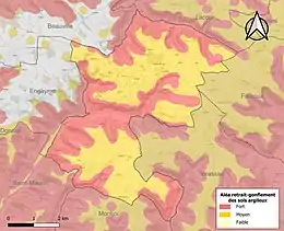 Le retrait-gonflement des sols argileux est susceptible d'engendrer des dommages importants aux bâtiments en cas d’alternance de périodes de sécheresse et de pluie. La totalité de la commune est en aléa moyen ou fort (92 % au niveau départemental et 48,5 % au niveau national). Sur les 292 bâtiments dénombrés sur la commune en 2019, 292 sont en aléa moyen ou fort, soit 100 %, à comparer aux 96 % au niveau départemental et 54 % au niveau national. Une cartographie de l'exposition du territoire national au retrait gonflement des sols argileux est disponible sur le site du BRGM[27],[Carte 3].
