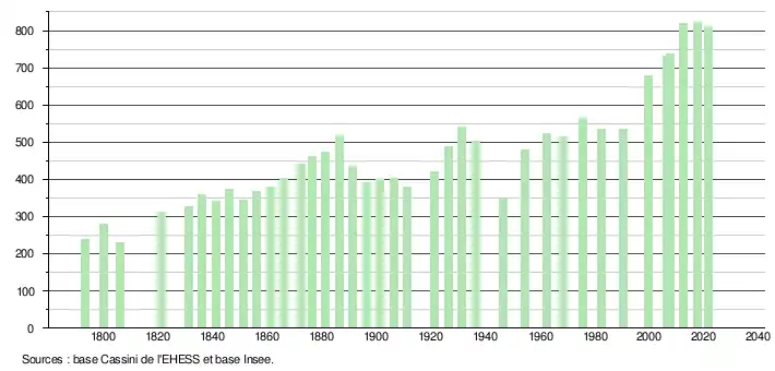 L'évolution du nombre d'habitants est connue à travers les recensements de la population effectués dans la commune depuis 1793. Pour les communes de moins de 10 000 habitants, une enquête de recensement portant sur toute la population est réalisée tous les cinq ans, les populations légales des années intermédiaires étant quant à elles estimées par interpolation ou extrapolation[22]. Pour la commune, le premier recensement exhaustif entrant dans le cadre du nouveau dispositif a été réalisé en 2007[23].