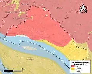 Le retrait-gonflement des sols argileux est susceptible d'engendrer des dommages importants aux bâtiments en cas d’alternance de périodes de sécheresse et de pluie. 81,6 % de la superficie communale est en aléa moyen ou fort (67,4 % au niveau départemental et 48,5 % au niveau national). Sur les 1 001 bâtiments dénombrés sur la commune en 2019, 1 001 sont en aléa moyen ou fort, soit 100 %, à comparer aux 84 % au niveau départemental et 54 % au niveau national. Une cartographie de l'exposition du territoire national au retrait gonflement des sols argileux est disponible sur le site du BRGM[32],[Carte 2].