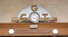 Aux quatre coins de la salle Croizat, quatre fresques identiques représentent le faisceau du licteur, une hache liée par trois fois de verges. Un bonnet phrygien coiffe le faisceau.