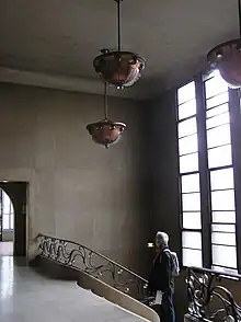 L'accès au premier étage est représentatif du style Art déco bordelais. La ferronnerie, les rampes, les lustres sont remarquables. Les lustres et les rampes sont constitués de cuivre et de boules de verre, matériaux utilisés en clin d'œil à la modernité technique : conducteur et isolant électriques.