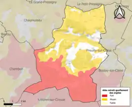 Le retrait-gonflement des sols argileux est susceptible d'engendrer des dommages importants aux bâtiments en cas d’alternance de périodes de sécheresse et de pluie. 85,2 % de la superficie communale est en aléa moyen ou fort (90,2 % au niveau départemental et 48,5 % au niveau national). Sur les 228 bâtiments dénombrés sur la commune en 2019, 153 sont en aléa moyen ou fort, soit 67 %, à comparer aux 91 % au niveau départemental et 54 % au niveau national. Une cartographie de l'exposition du territoire national au retrait gonflement des sols argileux est disponible sur le site du BRGM[34],[35].