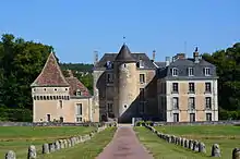À l'est du château, une avant-cour est limitée par des communs, aux toits couverts de tuiles, flanqués extérieurement de deux élégantes tours rondes. Le château comporte également une chapelle (1766) située au rez-de-chaussée de l'aile est, et à l'extérieur, un pigeonnier cylindrique et une glacière. Une grande allée bordée de tilleuls est située au sud du château (une partie des arbres centenaires a été abattue en 1991).