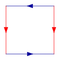 On se donne deux exemplaires d'un tel carré, et on obtient deux exemplaires de ruban de Möbius en faisant cette fois d'abord l'identification suivant les flèches bleues. Chacun de ces rubans a alors un seul bord : les côtés verticaux rouges qui ont été connectés à la suite de l'identification précédente ; recoller les deux rubans suivant leurs bords peut alors être considéré comme équivalent à recoller le bord droit du second carré, au bord gauche du premier, et vice-versa. On voit aisément qu'on retrouve alors bien le cylindre, mais avec l'identification des bords bleus déjà effectuée, c'est-à-dire la bouteille de Klein.