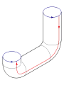 Voici un plan de montage dans ℝ3. À partir du carré initial, on colle les deux bords rouges l'un contre l'autre, dans le sens des flèches. La figure obtenue est un cylindre, dont on veut identifier les deux bords à l'aide des flèches bleues. Pour respecter le sens de ces flèches, il est nécessaire de retourner l'un des cercles avant de le recoller à l'autre, et pour cela, d'opérer une auto-intersection.