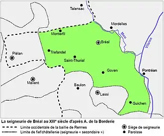Les premières occurrences de Bréal apparaissent dans des actes de la fin du XIIe et du début du XIIIe siècle. Elles sont présentées par l’abbé Guillotin de Corson[34] dans Le Pouillé historique de l’archevêché de Rennes. Ainsi, ecclesiam de Breal, apparaît dans une liste d’églises données par l’archevêque de Saint-Malo Jean de la Grille/de Châtillon dans une bulle du pape Eugène III de 1152[35],[36] et dans la charte de fondation du chapitre en 1157[37]. En 1164, le pape Alexandre III confirme aux religieuses de Saint-Georges de Rennes un droit de dîmes decimam in parrochia de Breal[34]. En 1202, elle devaient cependant renoncer aux bénéfices in ecclesia Sancti Maclovii de Breial[38]. En 1270 et en 1319, il est encore question de l’ecclesiam de Breal[35],[34], et de Parouësse de Brehal en 1541[39].