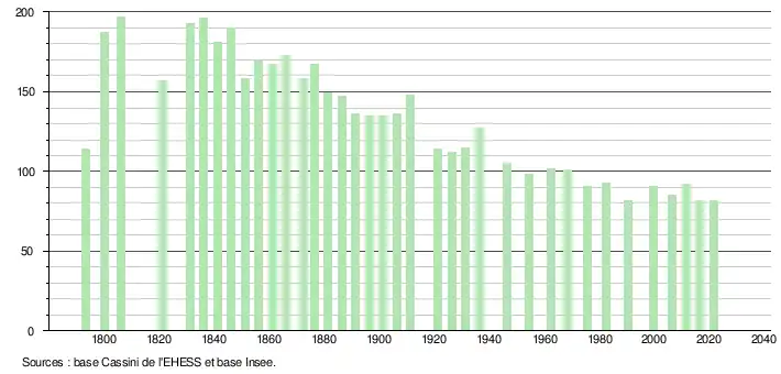 L'évolution du nombre d'habitants est connue à travers les recensements de la population effectués dans la commune depuis 1793. Pour les communes de moins de 10 000 habitants, une enquête de recensement portant sur toute la population est réalisée tous les cinq ans, les populations légales des années intermédiaires étant quant à elles estimées par interpolation ou extrapolation[18]. Pour la commune, le premier recensement exhaustif entrant dans le cadre du nouveau dispositif a été réalisé en 2006[19].