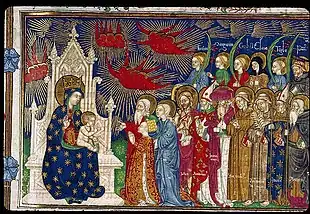 La première page montre, dans une miniature, Marie de Savoie présentée à la Vierge, tenant l'enfant Jésus sur ses genoux; la présentation est par Jean l'évangéliste et Marie-Madeleine, accompagnés des saints Jean-Baptiste, Ambroise, Jérôme, François, Antoine de Padoue, et par Louis d'Anjou, Antoine l'ermite, Pierre de Vérone et des saintes Catherine, Marguerite, Cécile, Claire et Thècle ; les noms sont inscrits sur leurs vêtements ou au-dessus de leur tête[4].