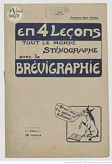 - Raoul Duval, En 4 leçons tout sur le monde sténographe avec la brévigraphie, Paris, Hector Ghilini, 8 p. (lire en ligne), p. 3-7