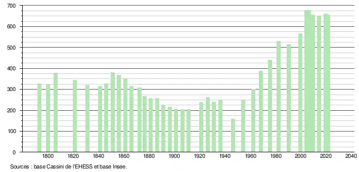 L'évolution du nombre d'habitants est connue à travers les recensements de la population effectués dans la commune depuis 1793. Pour les communes de moins de 10 000 habitants, une enquête de recensement portant sur toute la population est réalisée tous les cinq ans, les populations légales des années intermédiaires étant quant à elles estimées par interpolation ou extrapolation[31]. Pour la commune, le premier recensement exhaustif entrant dans le cadre du nouveau dispositif a été réalisé en 2004[32].