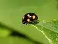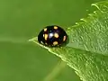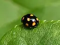 Sa livrée est noire, aux élytres ornés de dix taches, dont la couleur varie du jaune orange à orange vermillon. Son corps est plus allongé que les autres espèces du genre. Sa tête est noirâtre, le front largement maculé de beige, en forme de pointe de flèche. Ses yeux sont gris bleuté. Son pronotum conique est noir, les flancs maculés beiges, une tache formant un quart de cercle près de la tête. Ses élytres fermés forment un dôme arrondi, luisant. Chaque élytre est orné de cinq taches rondes variables. Certaines taches peuvent parfois converger.
