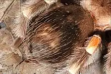 La partie arrière du corps est noire, et porte ainsi que les pattes des poils plus longs orangés et rougeâtres. C'est là aussi que se trouvent les poils urticants qui caractérisent cette espèce d'araignées.