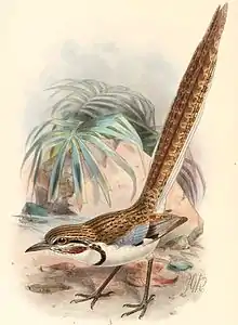 Le Brachyptérolle à longue queue est le seul de sa famille à présenter un dimorphisme sexuel apparent[2]. Son apparence très distinctive le rend reconnaissable de loin, avec sa silhouette rondelette et sa longue queue[3]. L'oiseau mesure de 34 à 47 centimètres de longueur, dont jusqu'à 30 centimètres de queue, ce qui en fait la plus longue queue des brachyptérolles[3],[4]. Les ailes sont courtes, les pattes longues et brun rosâtre[5]. Le mâle a une calotte chamois ou sable et les parties supérieures brun foncé avec des stries noires[4]. Le sourcil est d'une couleur chamois pâle, tandis que les parotiques sont de couleur brune[4]. Les yeux sont bruns, tandis que le bec court et fort est noir[1],[4]. Sa langue est longue avec une pointe en pinceau l'aidant à capturer les insectes dont il se nourrit[2]. Une bande blanche remplit l'espace sous-mustacien en partant de la base du bec, et est entourée de brun et de traits malaires noirs. Ces traits malaires et la bande noire du haut de la poitrine encadrent une gorge blanche[4]. La queue est marquée de 15 à 20 barres brun sombre, tandis que les rectrices extérieures sont bleu ciel, couleur qui est également présente sur les couvertures alaires[4]. En vol on remarque deux bandes noires et blanches sur les rémiges primaires et secondaires[4]. Les parties inférieures sont d'un gris clair et la poitrine blanche[4]. Les doigts sont zygodactyles, avec le premier et le quatrième doigt tournés vers l'extérieur et les deux du milieu tournés vers l'intérieur[5]. La femelle ressemble au mâle, mais est plus petite, avec la bande sur la poitrine plus étroite et une queue plus courte[4],[6]. Elle perd sa longue queue lors de la nidification[5]. Les juvéniles des deux sexes sont plus ternes que la femelle adulte, en particulier au niveau des bandes noires sur la poitrine, du cou et des yeux[3].