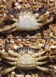 Un crabe « mou » (le crabe en mue est un mets que l'homme juge très raffiné) est un crabe qui fait sa mue et dévagine sa carapace, devenue trop petite, ce qui le rend non seulement vulnérable, mais lui enlève toute possibilité de défense. Pendant les quelques jours qu'il lui faut pour que sa nouvelle carapace durcisse, il se réfugie à la limite des eaux de marée moyenne et se cache sous les rochers, les algues, s'ensable ou même retourne dans son exuvie. Après la mue, il lui arrive de manger son exuvie pour restaurer ses réserves calciques[28].
