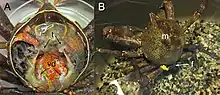 Des cas de cannibalisme sont répertoriés : certains mâles mangent la femelle molle qui vient de muer (cette mue est à l'origine de l'émission d'une phéromone qui déclenche l'accouplement), le crabe-violoniste Uca tangeri (en) mange ses enfants lorsqu'il ne trouve plus de ressources sur terre[21].