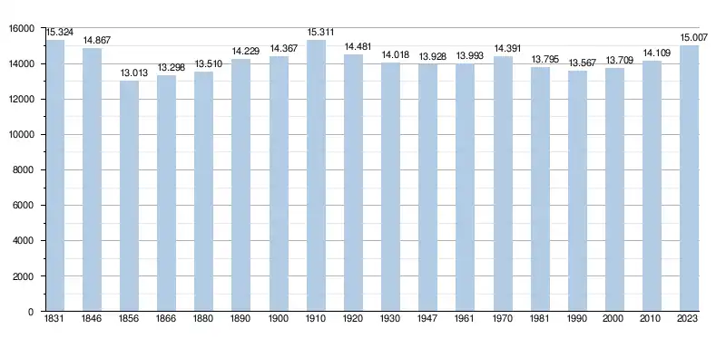 Elle comptait, au , 14 819 habitants (7 275 hommes et 7 544 femmes), soit une densité de 262,47 habitants/km²[7] pour une superficie de 56,46 km².