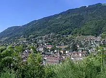 Vue de Brame-Farine à gauche du Grésivaudan depuis les vignobles de Montmélian au pied du massif des Bauges au nord. | |