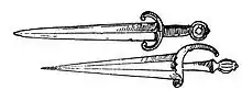 Au XIVe siècle, ce mot désigne une épée courte, portée à la ceinture sur le ventre[1].