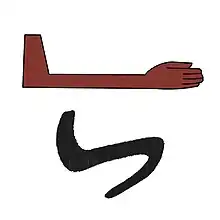 Il représente un bras (majoritairement l'avant-bras) en équerre. Il est translittéré ˁ.