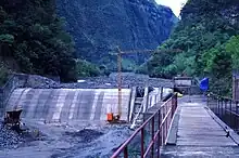 Vue du barrage hydroélectrique de la centrale du Bras de la Plaine, près de l'îlet du Bras Sec, en construction vers 1980.
