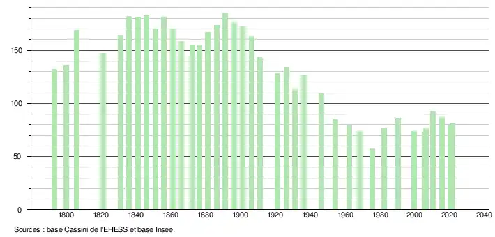 L'évolution du nombre d'habitants est connue à travers les recensements de la population effectués dans la commune depuis 1793. Pour les communes de moins de 10 000 habitants, une enquête de recensement portant sur toute la population est réalisée tous les cinq ans, les populations légales des années intermédiaires étant quant à elles estimées par interpolation ou extrapolation[23]. Pour la commune, le premier recensement exhaustif entrant dans le cadre du nouveau dispositif a été réalisé en 2005[24].