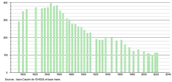 L'évolution du nombre d'habitants est connue à travers les recensements de la population effectués dans la commune depuis 1793. Pour les communes de moins de 10 000 habitants, une enquête de recensement portant sur toute la population est réalisée tous les cinq ans, les populations légales des années intermédiaires étant quant à elles estimées par interpolation ou extrapolation[18]. Pour la commune, le premier recensement exhaustif entrant dans le cadre du nouveau dispositif a été réalisé en 2008[19].
